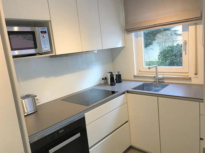High End-Komplettausstattung mit Miele-Geräten, Keramik-Arbeitsplatte, zwei Fenstern zum Garten, Dunstabzug, Backofen, Induktionskochfeld, Kühl-/Gefrierkombination, Mikrowelle, Spülmaschine.