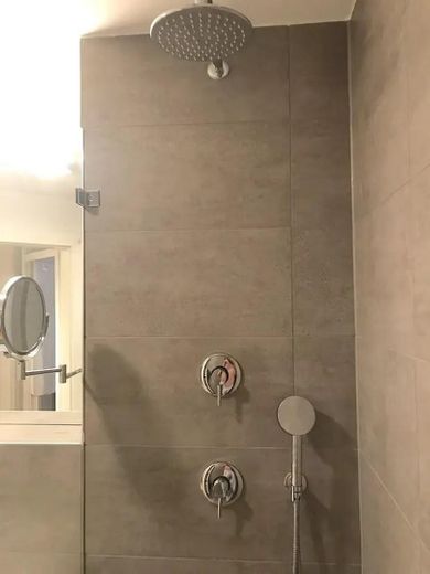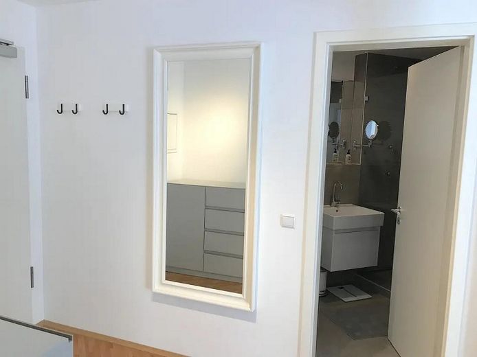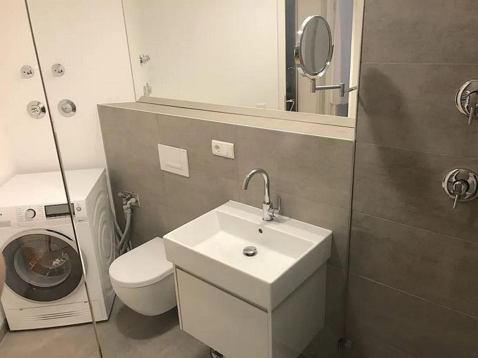 Luxusausstattung mit Naturfliesen, offener Dusche, Handtuchheizkörper, Waschtrockner, WC mit Softclosing-Funktion.