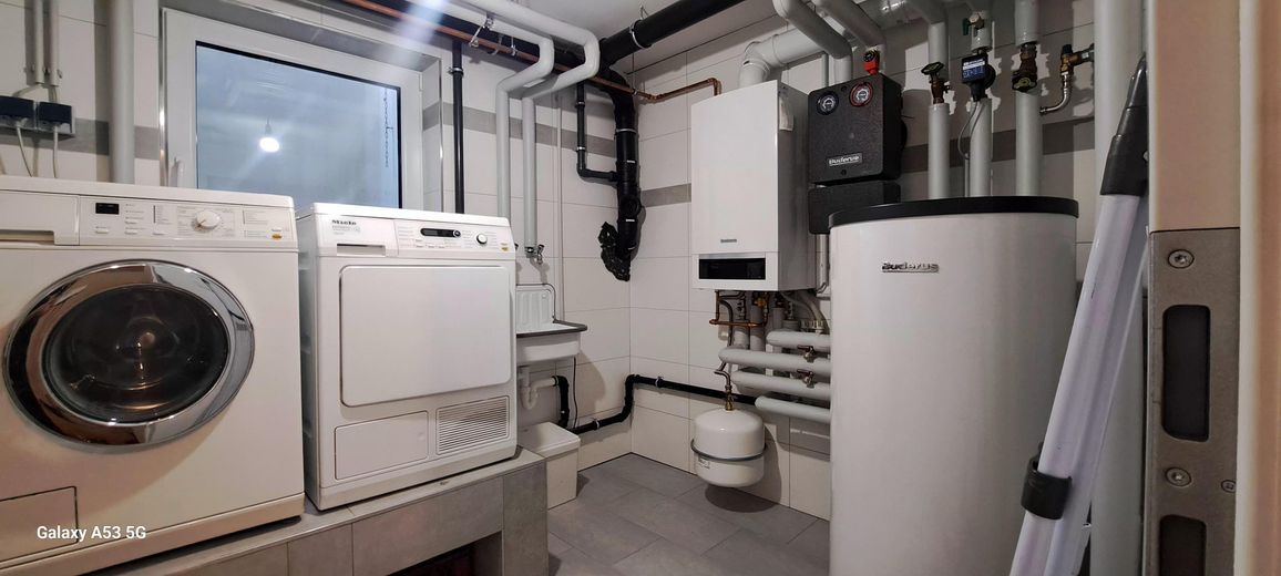 Wasch-/Technikraum mit vollständig gefliesten Wänden und Boden