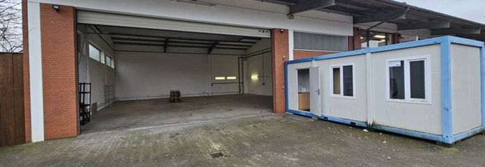 Große Lagerhalle mit elektr. Rolltor und Containerbüro in Gewerbegemeinschaft-Nähe Autobahnauffahrt