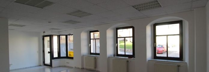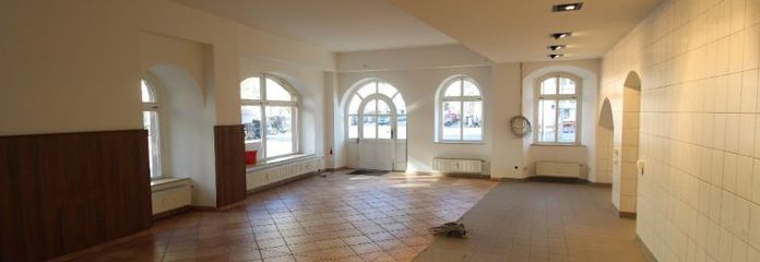 Gut sichtbares Ladengeschäft mit vielen Schaufenstern am Markt