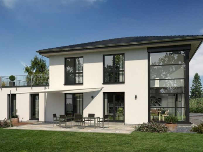Eine Stadtvilla, die überzeugt. Die klare Architektur wird durch den zusätzlichen Kubus und den äußerst großzügigen Glaseinsatz optimal ergänzt. Das garantiert einen maximalen Tageslichteinfall. Der an den Wohnbereich angeschlossene Anbau bietet zusätzlich Raum für Büro oder Gäste und bietet im Obergeschoss Raum für eine großzügige Dachterrasse