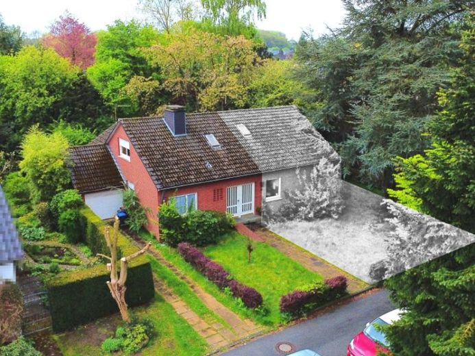 Das hier angebotene Teilgrundstück entspricht der auf den Bildern farbigen Grundstückshälfte. Bei der grau schraffierten Fläche handelt es sich jeweils um das andere Teilgrundstück.