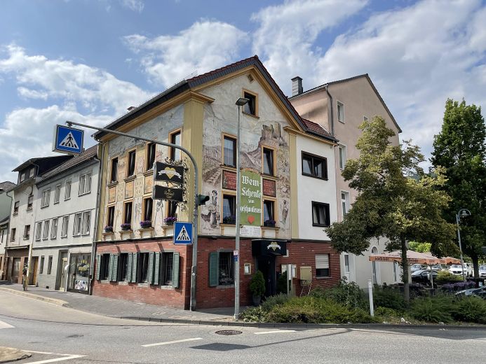Besonders ins Auge fällt die handbemalte Fassade mit historischen Illustrationen – ein kunstvolles Zeugnis der Vergangenheit als beliebte Weinschenke. Jahrzehntelang war hier das kultige Restaurant „Zum Geschwollenen Herz“ beheimatet, weit über die Stadtgrenzen hinaus bekannt und geliebt. Aktuell ist der Gastronomiebetrieb eingestellt; das Inventar wurde größtenteils entfernt – ein perfekter Neuanfang mit starkem Namen.