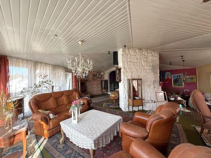 Nur eine Stufe tiefer liegt das gemütliche Kaminzimmer – ein behaglicher Rückzugsort, der durch die offene Verbindung zum Wohnbereich eine fließende Raumaufteilung schafft.
