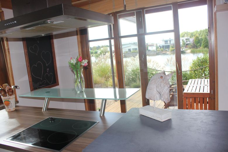Auf den teilweise überdachten Hartholzterrassen aus Garapa-Holz lässt sich die Abendsonne mit einem Glas Wein genießen, während das sanfte Plätschern des Wassers den Tag ausklingen lässt. Der pflegeleichte Garten ist harmonisch zum See hin gestaltet und von massiven Sandsteinblöcken eingefasst.