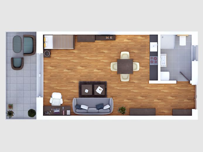 Moderne Ausstattung wie Laminatboden im Wohnbereich und Fliesen im Bad.