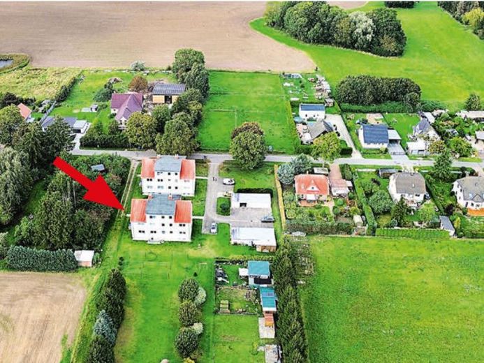 Auf dem großen Grundstück befinden sich Garagen und Gärten.