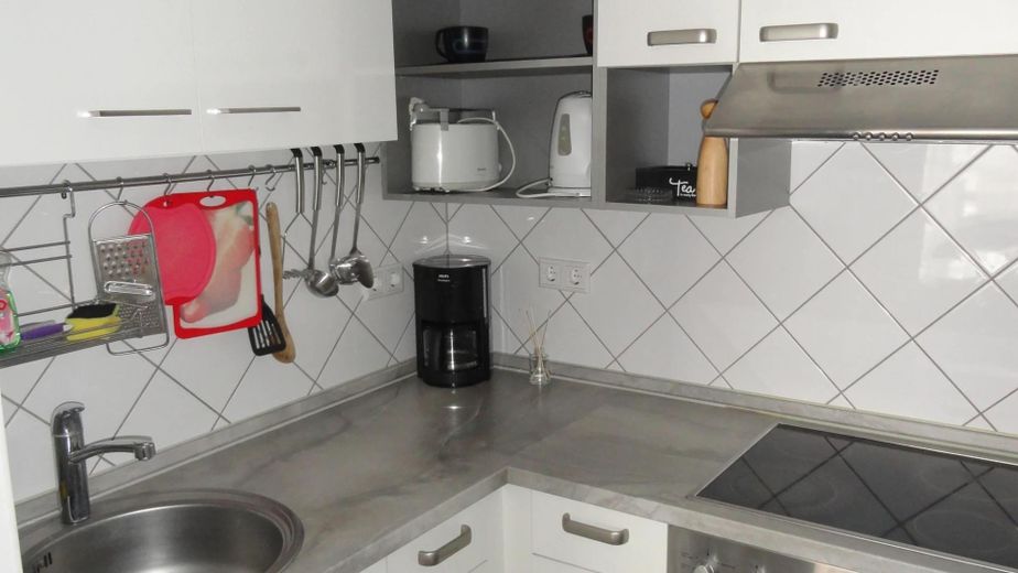 Separate, kompakte Einbauküche, vollständig ausgestattet (inkl. Utensilien, Kühlschrank und Waschmaschine)