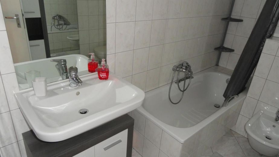 Großes, helles Badezimmer mit Badewanne, Bidet und Tageslicht