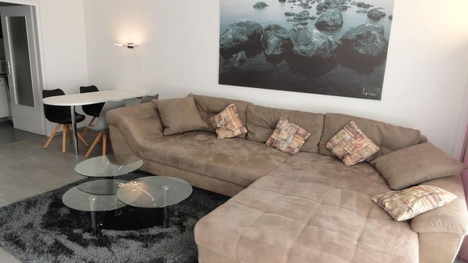 Helles Ess- und Wohnzimmer mit XXL-Couch, TV sowie Essecke mit Hochstühlen