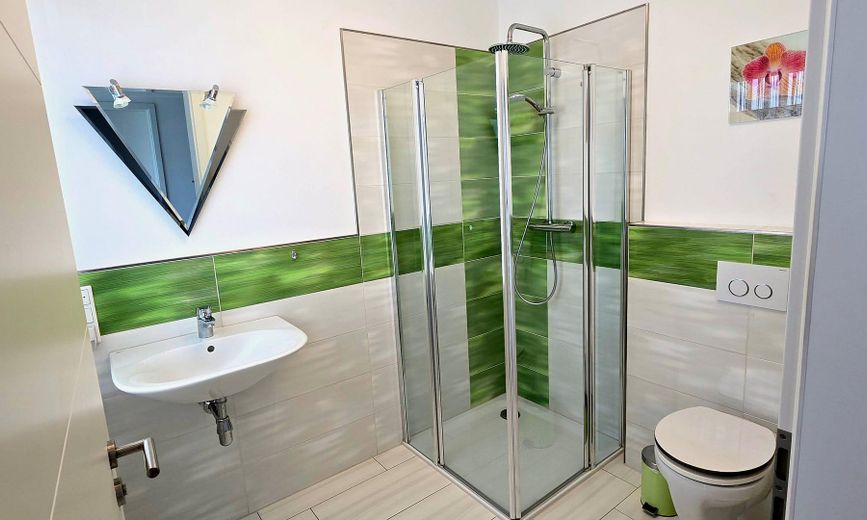 Badezimmer: Dusche 118cm*98cm, freistehende Badewanne, 2Waschbecken,