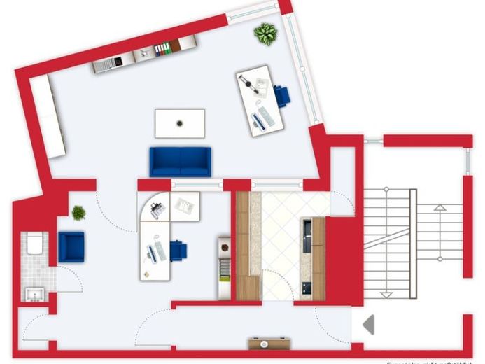 Aktuell sind die Räumlichkeiten in einen sehr großzügigen Empfangsbereich respektive Gemeinschaftsfläche sowie 1 einzelner, großer (Schulungs-) Räum, Toilette und einer Küche eingeteilt.
