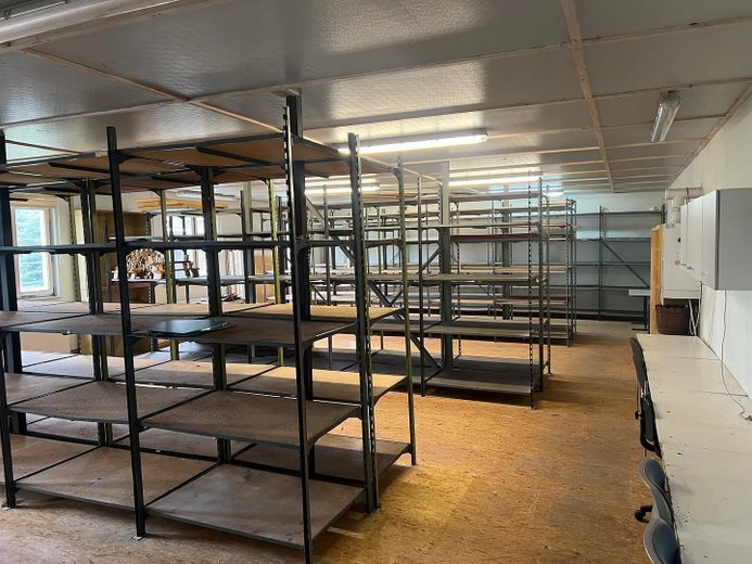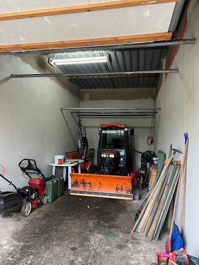 Eine der Garagen verfügt über ein großes Rolltor, wodurch sie als Abstellmöglichkeit für Wohnwagen, Wohnmobile oder andere Nutzfahrzeuge dienen kann. Die Lagerregale verbleiben ebenfalls.