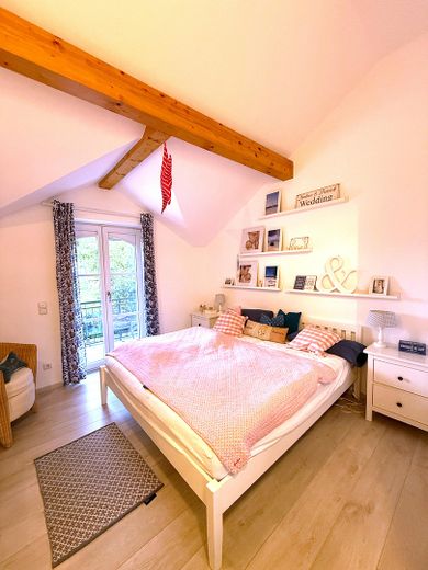 Im Obergeschoss befinden sich drei Schlafzimmer, ein Gästezimmer und ein modernes Badezimmer mit Dusche und Badewanne. Zwei Schlafzimmer und das Gästezimmer verfügen über Zugang zu einem der beiden Balkone. Bodentiefe Fenster schaffen überall eine helle und einladende Atmosphäre.