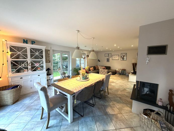 Im lichtdurchfluteten Wohn- und Essbereich sorgen bodentiefe Fensterfronten für eine helle, freundliche Atmosphäre. Dieser großzügige Raum bietet direkten Zugang zur überdachten Terrasse, zum Garten sowie zum Poolbereich.