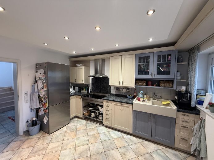 Das Erdgeschoss mit dem geräumigen Eingangsbereich verfügt über eine schöne geschreinerte Garderobe, einen Abstellraum sowie ein Gäste-WC. Die Einbauküche im Landhausstil bietet direkten Zugang zum offenen Wohn-/Essbereich.
