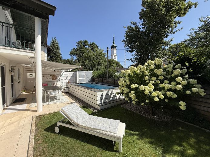 Der gepflegte Garten mit zwei Terrassen, Sitzmöglichkeiten, Pool und Gartenhaus lädt zu erholsamen Stunden und geselligen Abenden ein. Eine Doppelgarage mit zusätzlichem Stauraum rundet das Angebot ab.