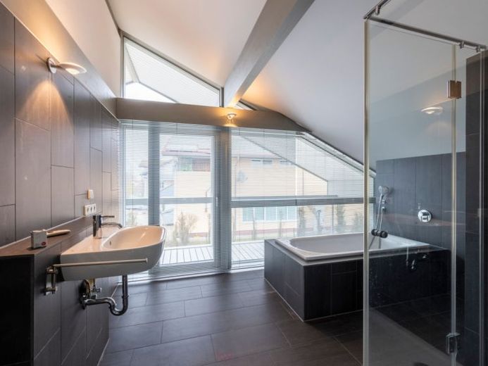 Hier befindet sich, ebenfalls außergewöhnlich und hochwertig von der Firma Huf-Haus errichtet, eine moderne 2-Zimmer Wohnung mit zwei Balkonen mit ca. 90 Quadratmetern, die auch gewerblich als Ausstellungsfläche oder Büroeinheit genutzt werden kann. Darunter befinden sich 3 Garagen sowie ein Lager/Werkstattraum in Wohnraumqualität (beheizt). Diese Einheit verfügt über ein modernes Bus-System und eine Luft-Wasser-Wärmepumpe der Firma Elco.