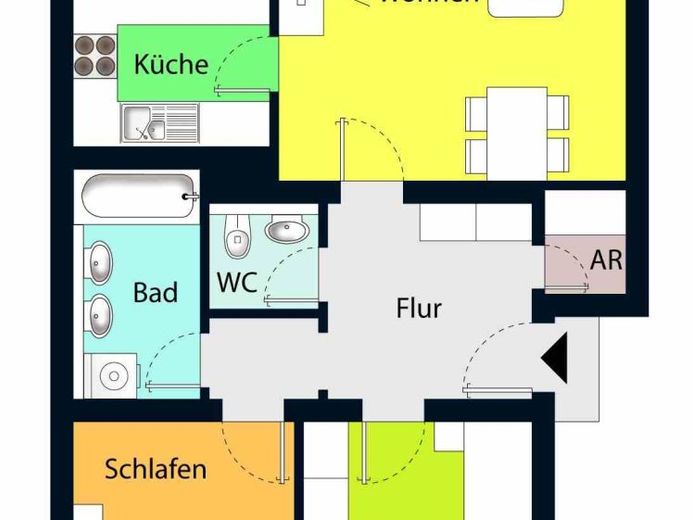 Das Badezimmer verfügt über eine Badewanne und einen Anschluss für die Waschmaschine. Ein separates WC sorgt für zusätzlichen Komfort. Ein Abstellraum innerhalb der Wohnung bietet nützlichen Stauraum.