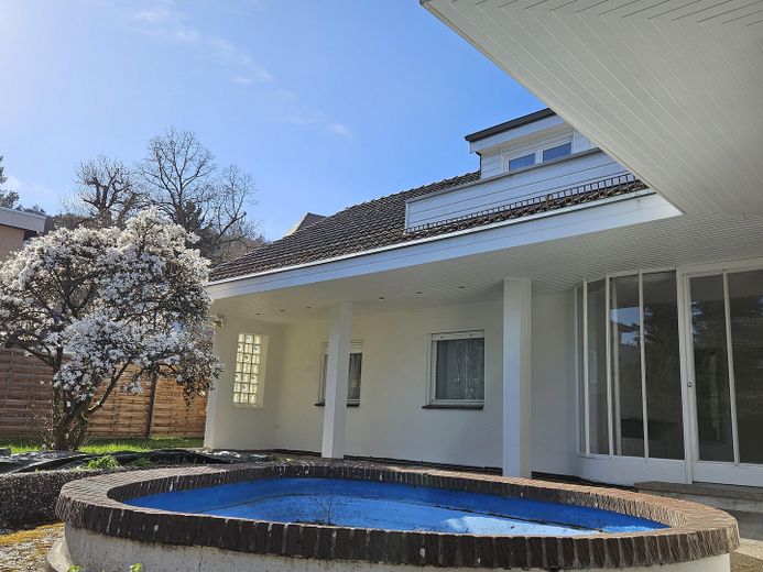 Ausstattung: Winkelbungalow im 60er-Jahre-Charme mit besonderer Architektur, Wohn- und Essbereich mit großen Fensterfronten, hochwertige Einbauküche, 2 Tageslicht-Bäder, Tageslicht-Gäste-WC, große, überdachte Terrassen, Offener Kamin, Garten mit Wasserbecken, altem Baumbestand u. zusätzl. Kellerzugang, Garage u. Stellplatz