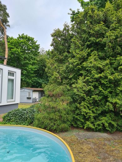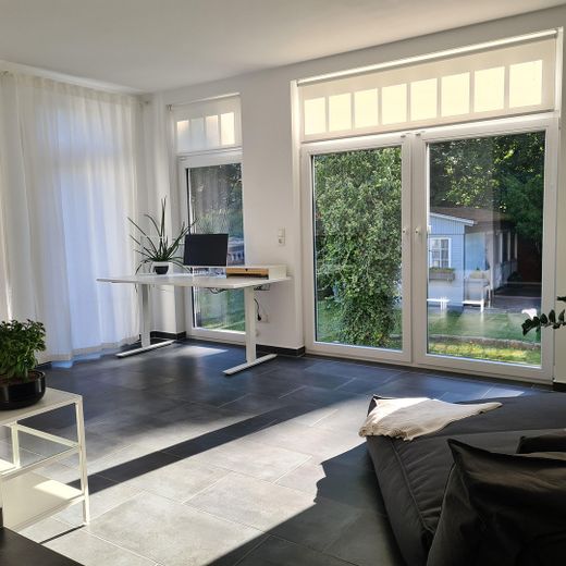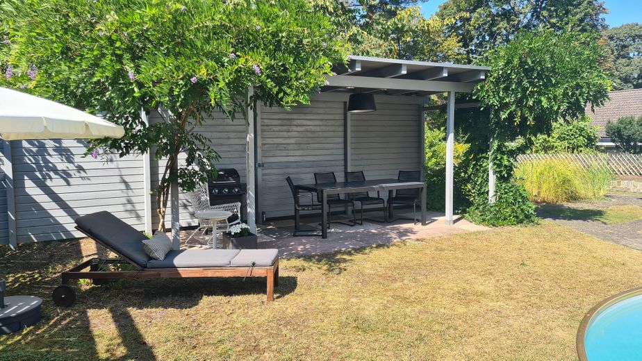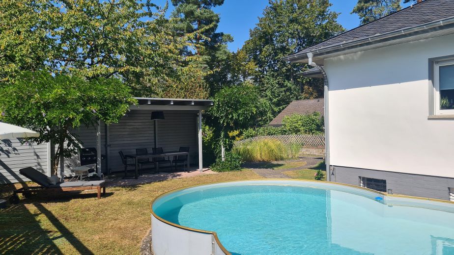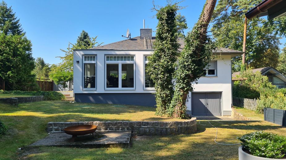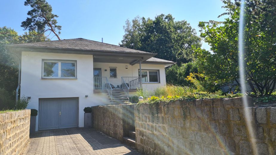 Zum Verkauf steht ein ab 2017 hochwertig modernisierter Bungalow in erhöhter Lage, einer langen Zufahrt und einem parkähnlichen Grundstück mit Pool auf ca 1605 qm.