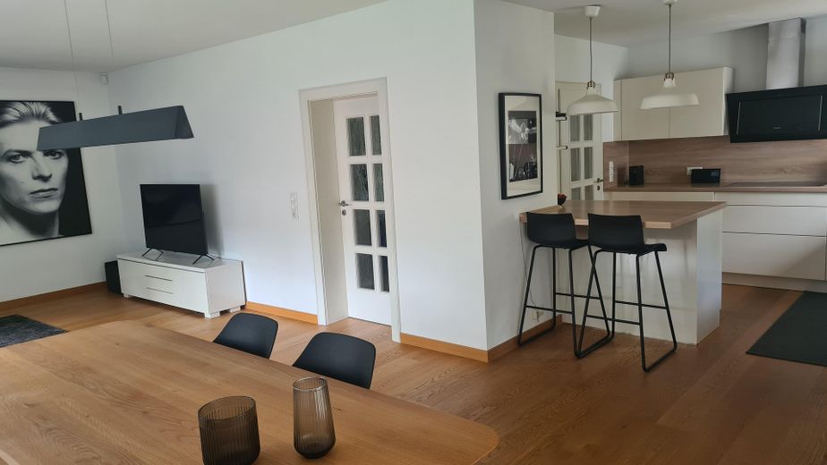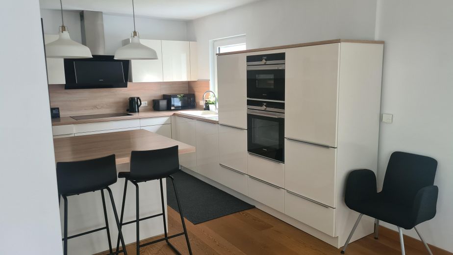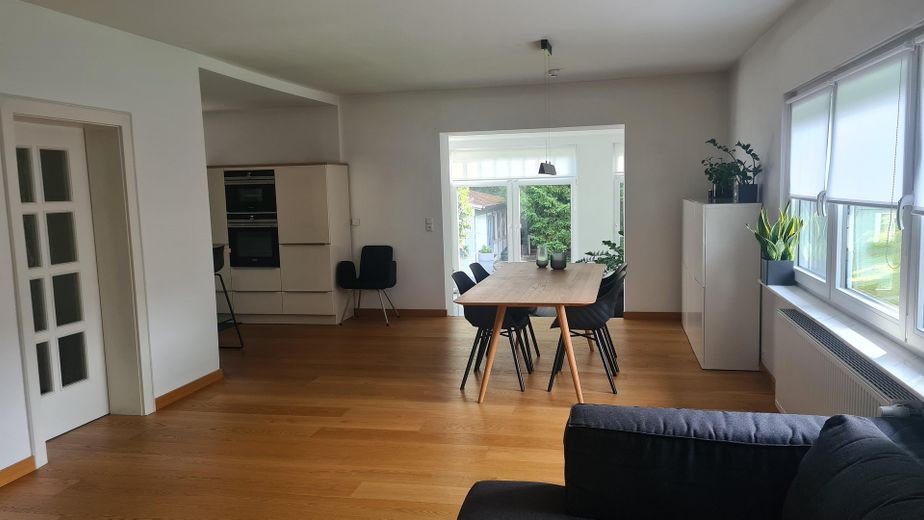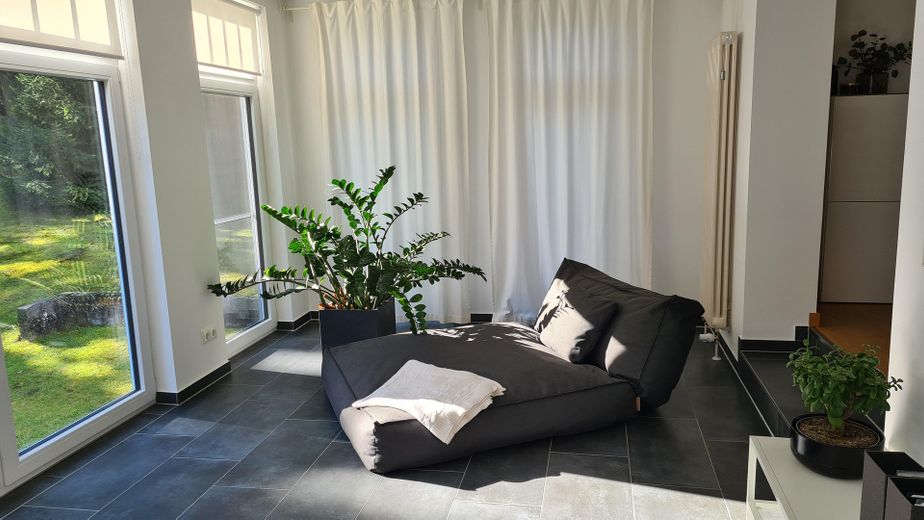 Im Erdgeschoß befinden sich 2 Schlafzimmer, ein Tageslichbad, großer Wohn-, Ess- und Küchenbereich mit Zugang zum Wintergarten mit bodentiefen Fenstern und toller Sicht auf den hinteren Garten. Eine elegante Massivholztreppe führt zum Souterrain. Dort befindet sich ein Schlafzimmer und ein Bad mit Dusche (zählen zur Nutzfläche, sind aber wohnlich ausgebaut) sowie ein Hauswirtschaftsraum mit Anschluss für Waschmaschine und Trockner und ein Kellerraum sowie die Doppelgarage.