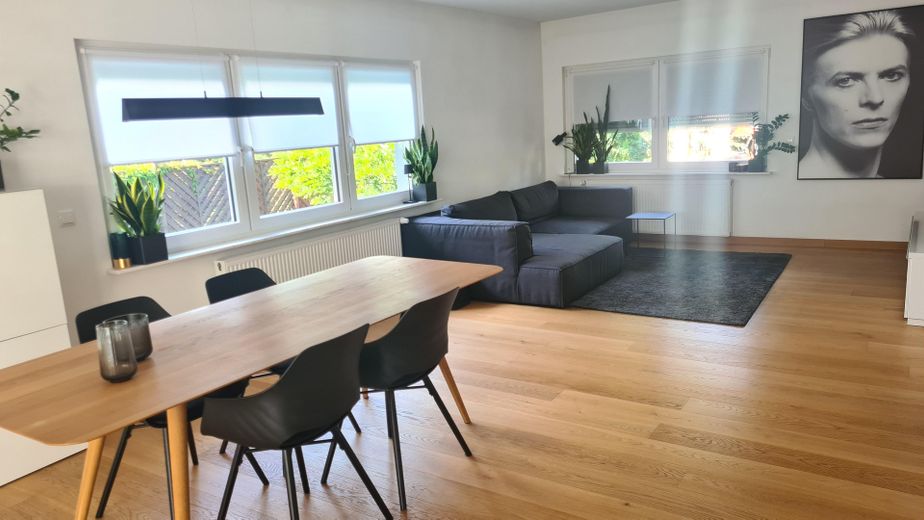 • Wohnzimmer mit Holzfußboden Eiche massiv