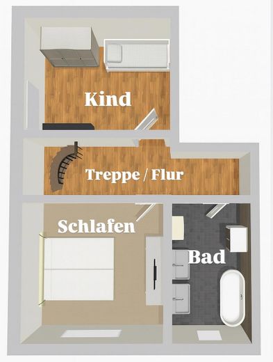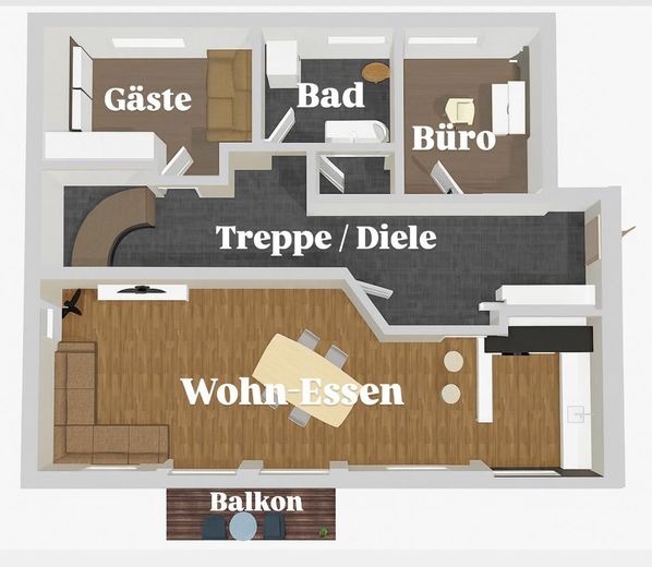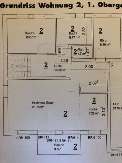 Der Wohnungseingang befindet sich im 1. Obergeschoss. Hier erwarten Sie der helle, lichtdurchflutete Wohn- und Essbereich, die Küche, sowie zwei weitere Zimmer und ein Badezimmer mit ebenerdiger Dusche.