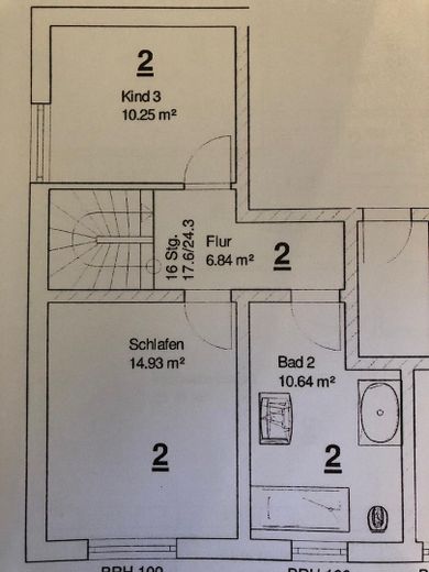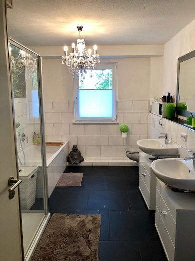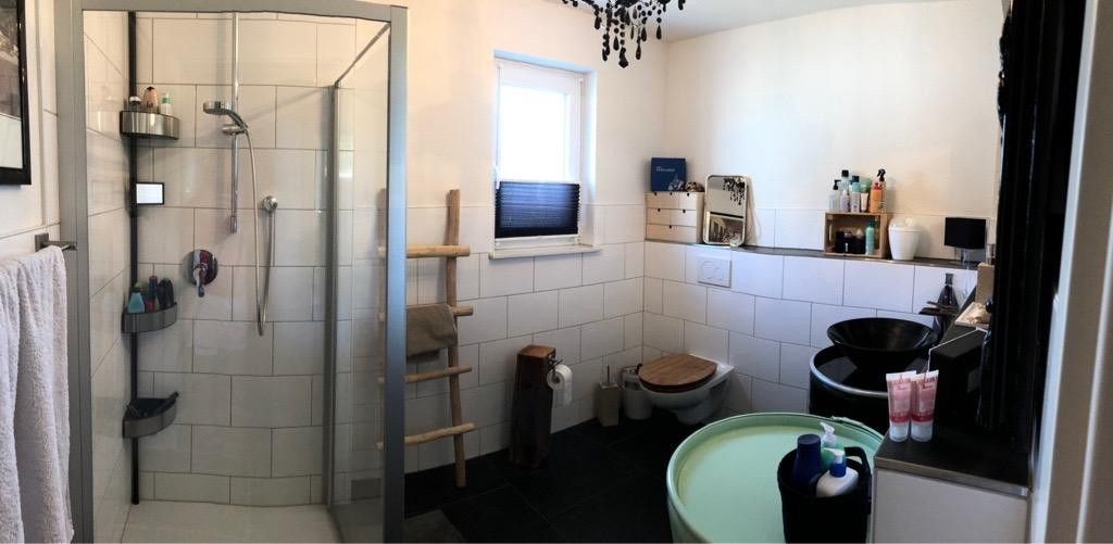 Das Erdgeschoss verfügt über zwei weitere Zimmer, sowie ein zweites großes Badezimmer mit Badewanne und ebenerdiger Dusche.