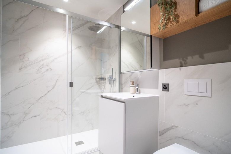 Hinter dieser verbirgt sich ein geräumiger Flur, welcher Ihnen die Möglichkeit zur Installation einer Garderobe bietet. Linker Hand befindet sich das hochwertig ausgestattete badezimmer das über eine barrierefreie Dusche verfügt. Über den Flur gelangen Sie direkt in den offenen und geräumigen Wohn- und Essbereich.