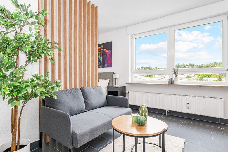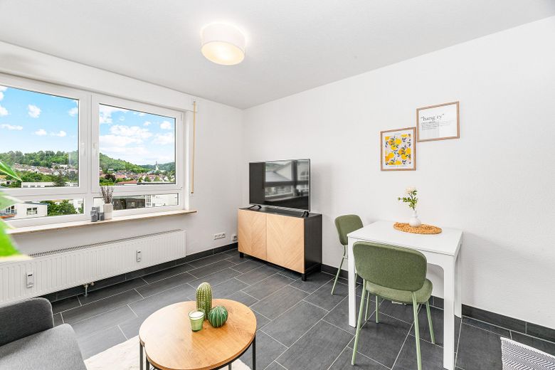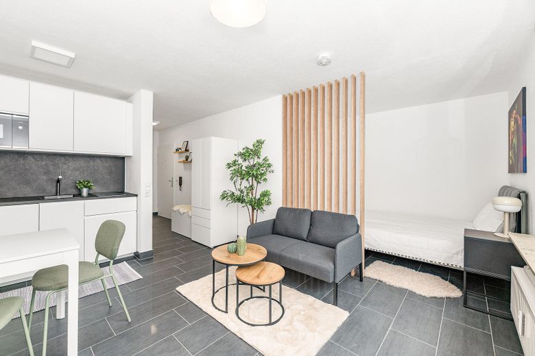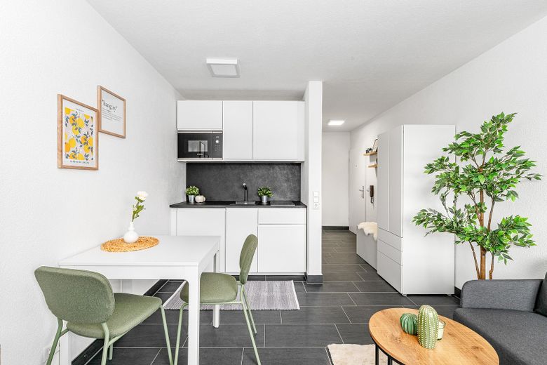 Der kombinierte Wohn- und Schlafbereich überzeugt mit einem pflegeleichten Fliesenboden und einer hellen, freundlichen Ausstrahlung. Die kompakte Einbauküche ist bereits im Kaufpreis enthalten und bietet eine moderne, platzsparende Ausstattung für den Alltag.