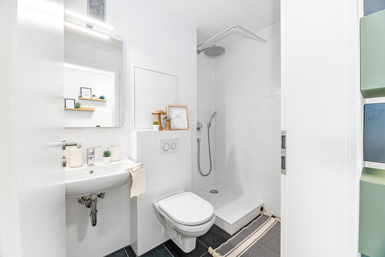 Das Badezimmer ist zeitgemäß ausgestattet, verfügt über eine Dusche und bietet zudem einen Anschluss für die Waschmaschine – ideal für ein unabhängiges Wohnen.