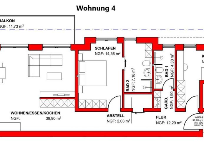 Das Angebot bezieht sich auf die Wohnung 4 in Wohnebene 3. Sie gelangen über eine geräumige Diele mit Garderobe in die Wohnung. Von der Diele gelangen Sie iden großzügigen Wohn/Essbereich mit integrierter Küche von ca. 40 m² mit Zugang auf den schönen Balkon von ca. 12 m². Ebenso erreichen Sie von der Diele den Elternprivatbereich. Dieser besteht aus dem geräumigen Schlafraum von ca. 15 m² sowie dem Elternbad mit Fenster von ca. 8 m².