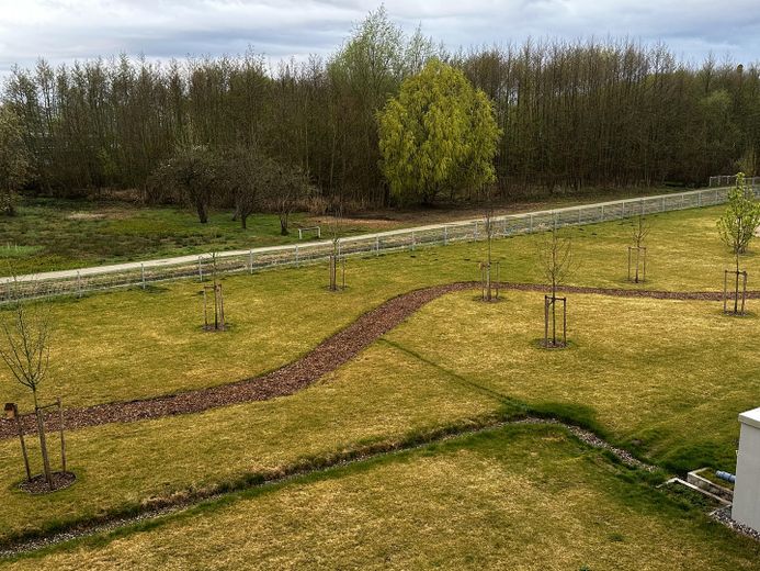 Ein großes Gartengelände mit Streuobstwiese umgibt unverbaut die Südseite des Häuserkomplexes und kann durch alle Miteigentümer genutzt werden.