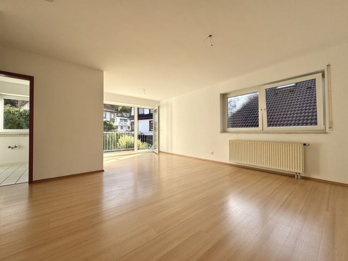 Rechter Hand betreten Sie in Ihr großzügiges und helles Wohnzimmer mit ausreichend Platz, um eine gemütliche Wohnlandschaft sowie einen Essbereich einzurichten. Vom Wohnzimmer aus haben Sie Zugang zum Balkon in Ost-Ausrichtung mit herrlichem Blick ins Grüne und zu den Weinbergen.
