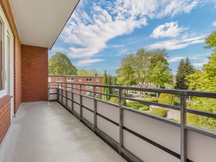 Vom halbüberdachten Balkon schauen Sie auf die ruhige Grünfläche der Wohnanlage – und genießen dank der niedrigen Umgebungsbebauung einen weiten Ausblick. Hier können Sie z. B. an lauschigen Sommerabenden in aller Ruhe ihr Feierabendgetränk genießen.