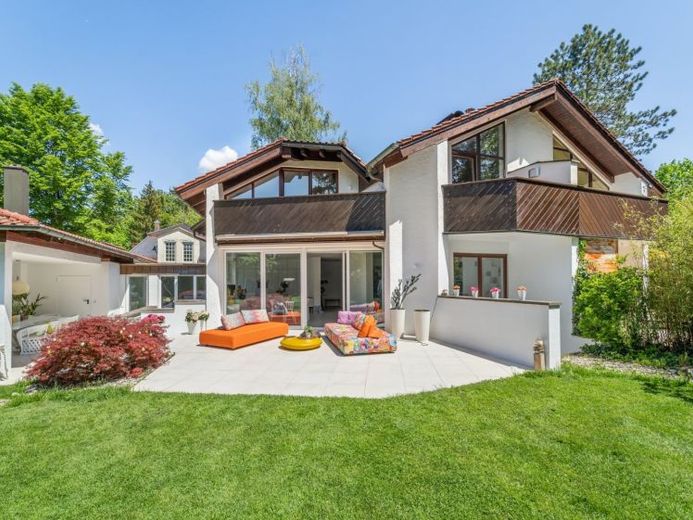 Dieses großzügige Ensemble-Haus befindet sich auf einem parkähnlichen Grundstück mit insgesamt über 1.000 qm zur Sondernutzung in Toplage von Grünwald in der Nähe der Bavaria Filmstudios am Geiselgasteig. Die Südausrichtung der Terrasse mit weitläufigem Garten lädt zum Sonnenbaden, Grillen und Relaxen ein. Im Osten grenzt direkt eine größere bewaldete Grünzone, der Grünwalder Forst, an das Ensemble. Herrliche Wanderungen oder Ausfahrten bieten sich förmlich an.