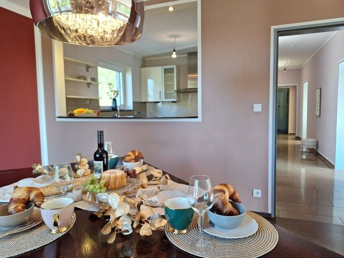 Das Erdgeschoss bietet rund 120 m² lichtdurchflutete Wohnfläche mit einem offenen, großzügigen Wohn- und Essbereich als Herzstück. Hier verbindet sich modernes Wohnen mit der stillen Präsenz der Natur – durch große Fenster fällt der Blick direkt ins Tal, das Rauschen der Blätter wird zur leisen Hintergrundmusik des Alltags. Ein ruhiges Schlafzimmer, ein separates Arbeitszimmer sowie ein Vollbad und Gäste-WC machen das Wohnen komfortabel und durchdacht.