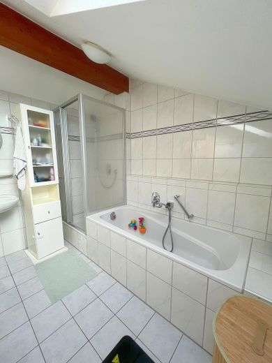 Der durchdachte Grundriss überzeugt mit einem hellen offenen Wohn- und Essbereich, einem separaten Schlafzimmer sowie einem gemütlichen Kinderzimmer. Die Küche ist funktional ausgestattet und kann vom Vormieter erworben werden. Das Tageslichtbad ist klassisch gefliest und mit Badewanne sowie Dusche ausgestattet, ein zusätzliches Gäste-WC bietet kurze Wege im unteren Geschoss. Vom Wohnbereich gelangen Sie auf den Balkon mit Aussicht über Pforzheim – ideal für entspannte Momente im Freien.