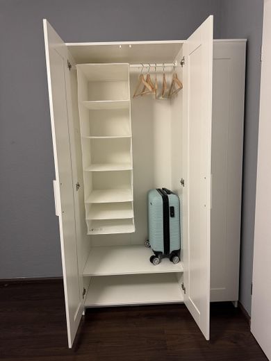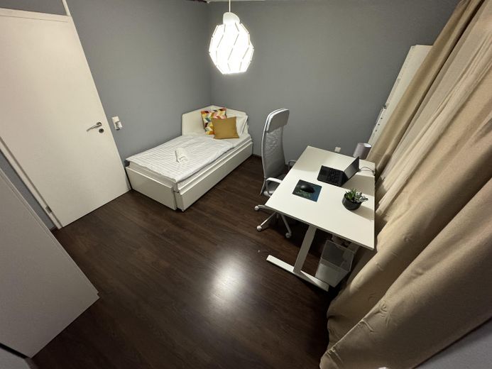 Each room has a large wardrobe for ample storage, an adjustable motorized desk for ergonomic work, curtains for privacy and comfort, a single bed that can be extended into a double bed, and shelves with additional storage for personal belongings.