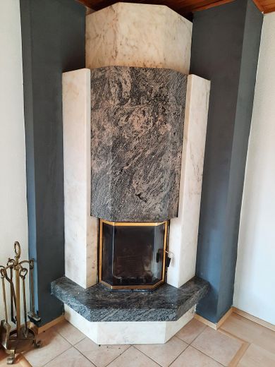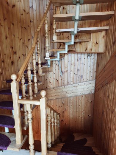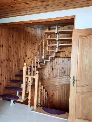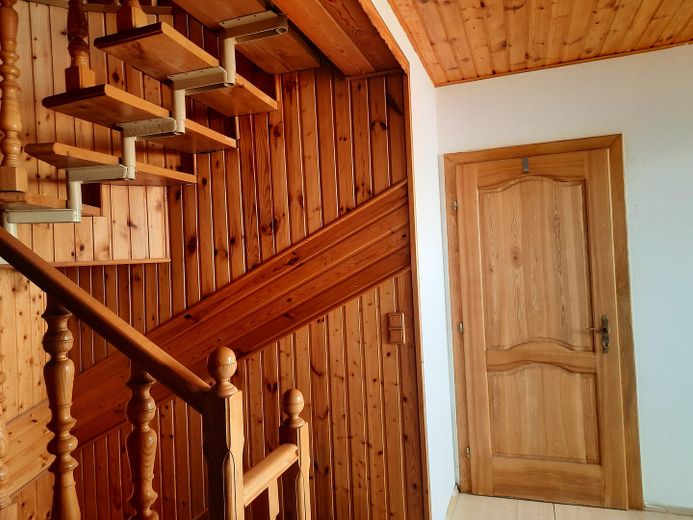 Das Haus ist aus Holzstämmen gebaut und ist ein Niedrigenergiehaus. Die Wohnung selbst ist aufwendig mit Holz verziert. Voll gefliestes Bad verfügt über die Badewanne und Dusche. Eine 18qm große Küche ist mit moderner Einbauküche ausgestattet. Im Wohnzimmer steht ein hochwertiger Kaminofen. Regenwasseranlage zu Wassereinsparung.