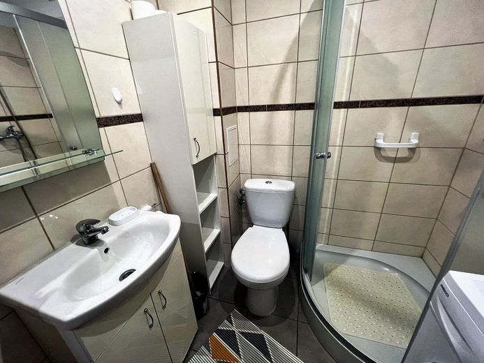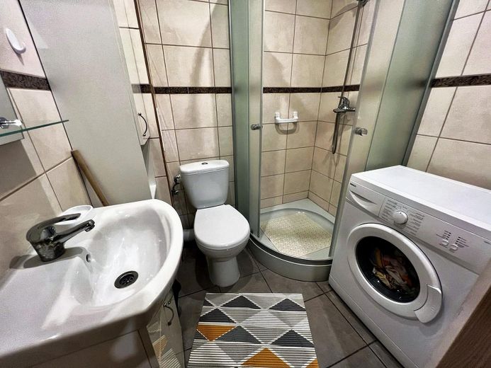 Das Badezimmer umfasst Dusche, Waschmaschine, Waschbecken, Spiegel und Toilette. Ein praktisches Ankleidezimmer mit Schienen und Regalen sowie ein Spiegel im Flur runden die funktionale Aufteilung ab (Diele, Wohnzimmer, Küche, Bad, Ankleide).