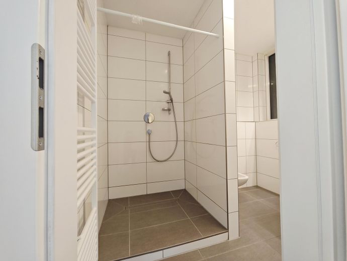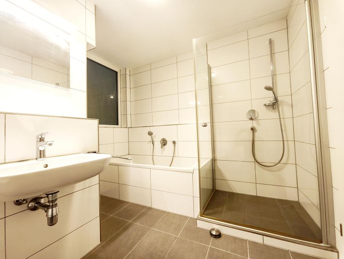 Das stilvolle Badezimmer mit hochwertigen Fliesen, edlen Armaturen und einem integrierten Waschmaschinenanschluss erfüllt höchste Ansprüche. Ein separates Badezimmer mit Dusche sorgt für zusätzlichen Komfort im Alltag.