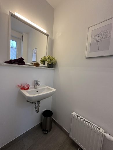 Außerdem befindet sich auf dieser Etage ein modernes Badezimmer mit Badewanne, bodengleicher Dusche und Waschbecken. Der Badezimmerboden ist mit einer Fußbodenheizung ausgestattet.