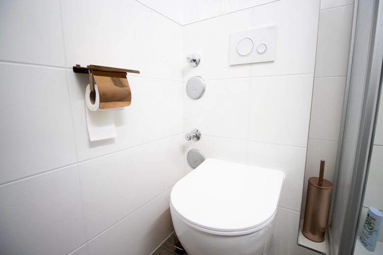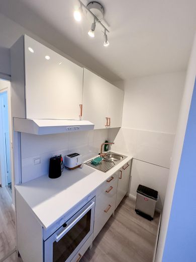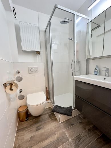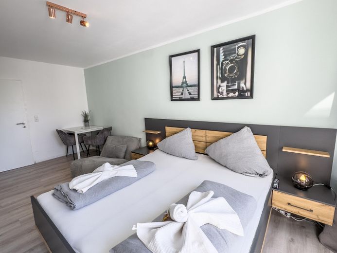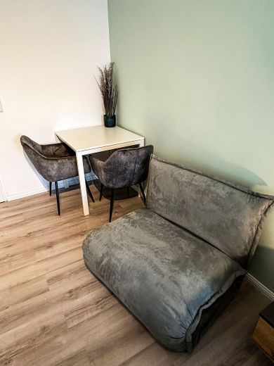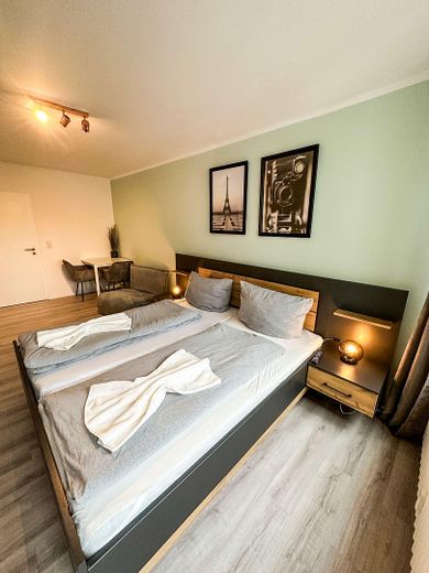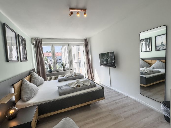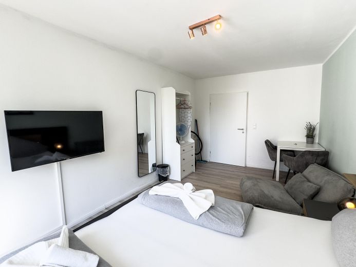 Das Apartment überzeugt durch seine großzügigen Fenster, die für eine angenehme Helligkeit sorgen. Der Wohn- und Schlafbereich ist modern möbliert und bietet ein 1,80 m breites Doppelbett, ein Einzelschlafsofa, einen Essbereich sowie einen Fernseher mit Netflix-Zugang. Ein geräumiger Kleiderschrank sorgt für zusätzlichen Stauraum.