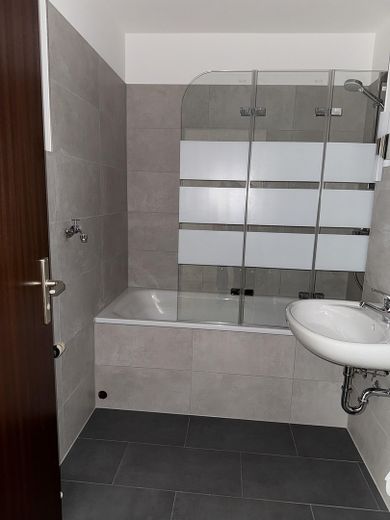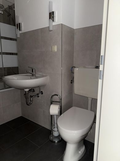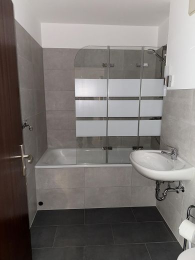 Das Badezimmer verfügt über eine praktische Duschbadewanne, die sowohl schnelles Duschen als auch entspannte Badezeiten ermöglicht. Ein Waschmaschinenanschluss ist ebenfalls vorhanden, sodass Sie Ihre Geräte bequem integrieren können.