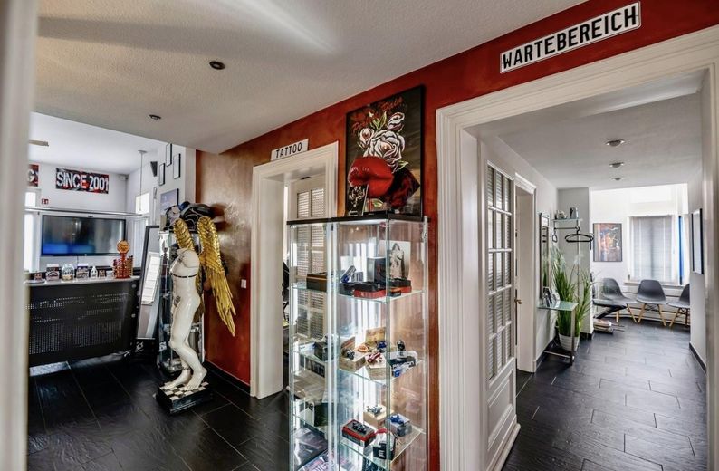 Im ersten Obergeschoss setzt sich die gewerbliche Nutzung fort. Ein Flur führt zu drei hellen Räumen, die ebenfalls unterschiedlich genutzt werden können. Ein zusätzliches Bürozimmer und ein WC bieten weiteren Komfort. Eines der vielen Highlights dieser Immobilie ist die Dachterrasse, die sich ideal für entspannende Pausen im Freien eignet und einen schönen Blick auf den mit weißen Kieselsteinen versehenen Innenhof bietet.