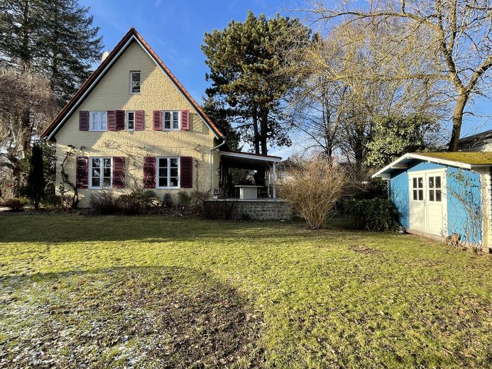 Dieses großzügige, idyllisch gelegene Einfamilienhaus mit ca. 226 m² Wohnfläche sowie ca. 58 m² Nutzfläche im Keller, einem Grundstück von ca. 1050 m² und einer Terrasse von fast 60 m², befindet sich im beliebten Teltow-Seehof. Das Haus verfügt über 9 Zimmer und zwei Badezimmer, zwei Gästetoiletten (alle tagesbelichtet) sowie eine ehemalige Garage, die umgebaut wurde und als Büro genutzt wird. Die Deckenhöhe des Büros ist bis zu 3,50 m hoch. Der Keller bietet (in einem ehemaligen Bunker) nicht nur viel Stauraum, sondern auch einen Technikraum mit Waschmaschinen- und Trockneranschluss. Zusätzlich befindet sich hier auch ein großes tagesbelichtetes Zimmer, welches auch von außen zugänglich ist.