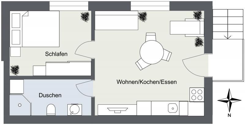 - Wohnzimmer mit offener Küche, Schlafzimmer, innenliegendes Duschbad - alles da!